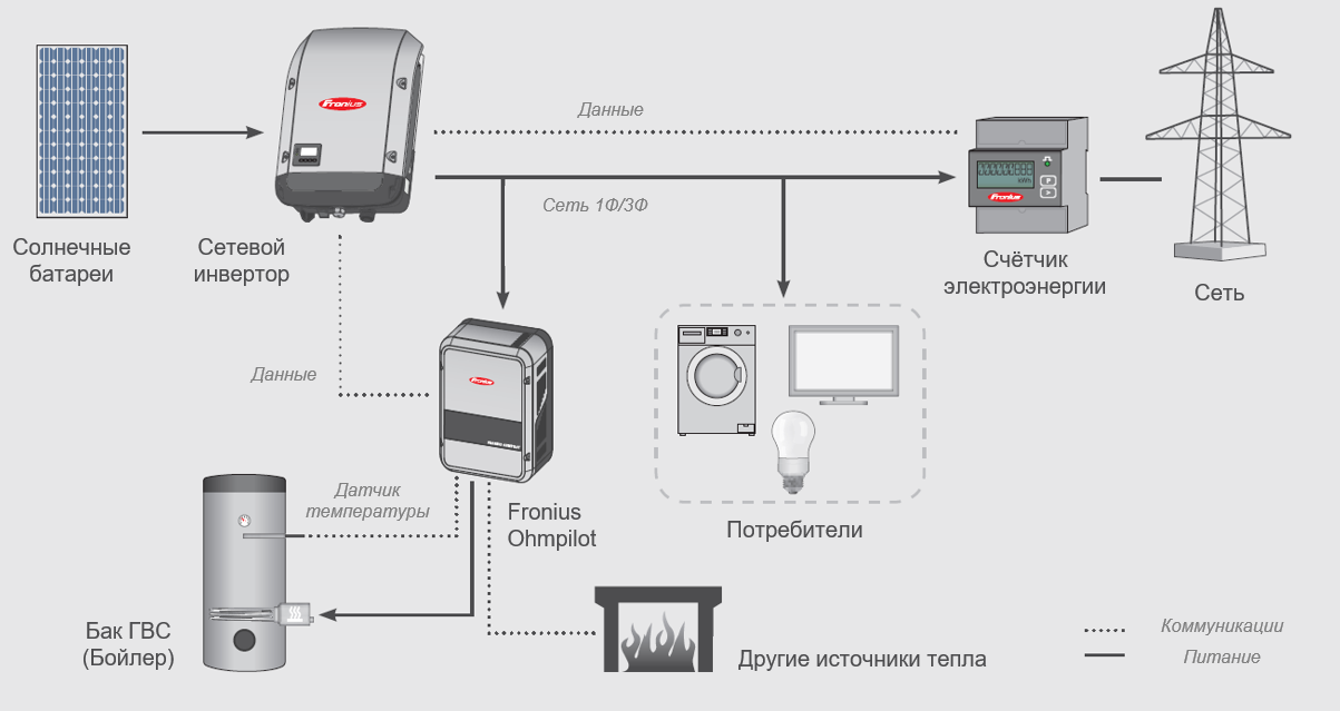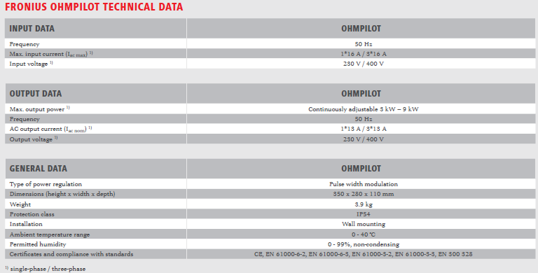 Fronius Ohmpilot інформаційно з’єднується зі встановленим у системі лічильником Fronius smart meter і даталогером мережного інвертора, і коли він бачить, що є надлишок електроенергії, який не використовується на самоспоживання, він автоматично включає бойлер для нагрівання води. Широкі можливості роботи Fronius Ohmpilot дозволяють вмикати навантаження від 300 Вт до 9 кВт. Також на один пристрій можна підключити від одного до трьох однофазних 3 кВт ТЕНів. При цьому пристрій компактний всього 35х28х11 см і вагою 3,9 кг.
