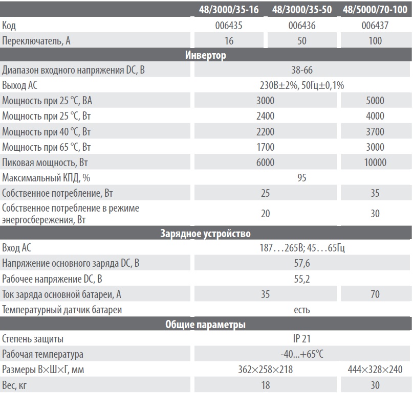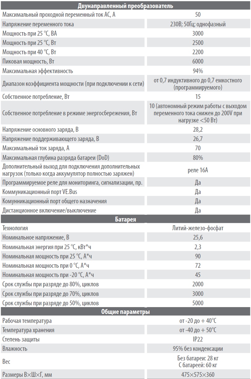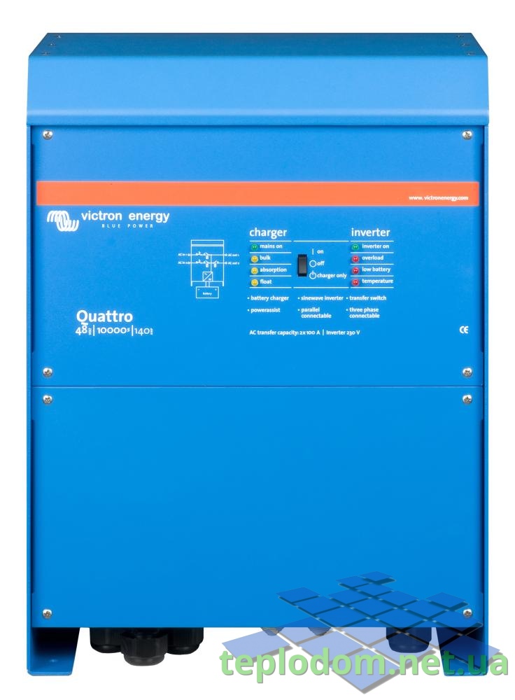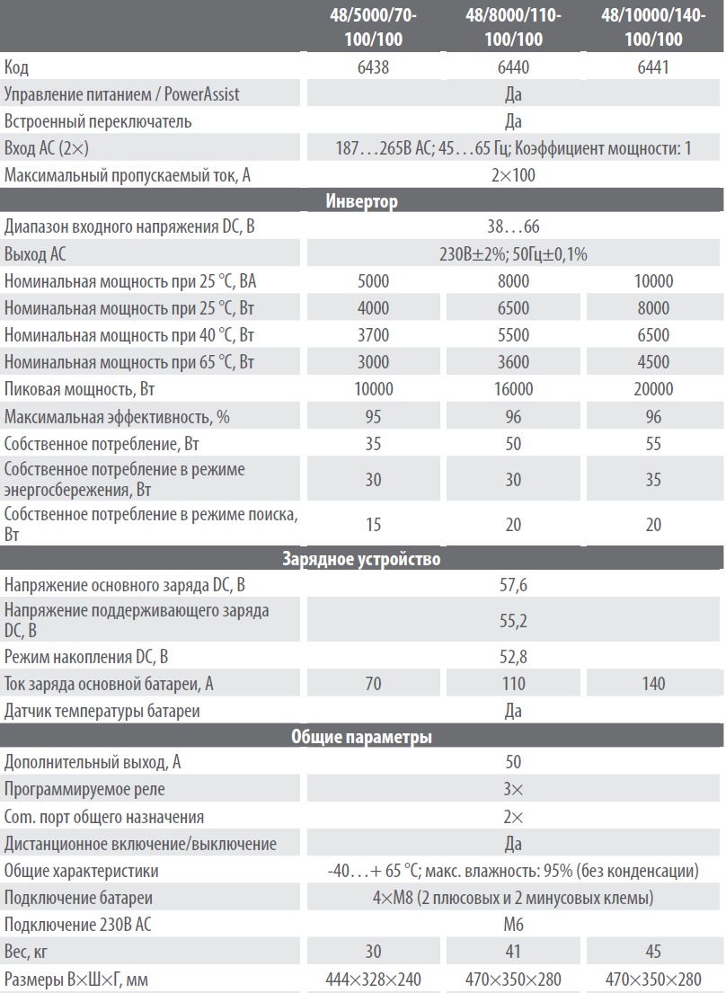 Багатофункціональні інвертори MultiPlus від Victron Energy здатні заряджати акумуляторний парк напругою 48 вольт від зовнішніх джерел, таких як генератори та сонячні електростанції, перетворювати постійний струм від батарей у змінний з чистою синусоїдою, а також, в режимі перевантаження, пропускати через 10кВт.