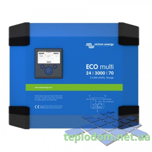 Гібридний інвертор з вбудованою літій-іонною акумуляторною батареєю на 2,3 кВт*год. Victron Energy ECOmulti дозволяє заряджати акумулятор від сонячних панелей (необхідний додатковий сонячний інвертор із контролером заряду), забезпечуючи електропостачання споживачів. Для компенсації нестачі вироблення фотомодулів ECOmulti здатний заряджати батарею від мережі загального користування. При піковому споживанні, що перевищує потужність інвертора, ECOmulti пропускатиме через себе до споживачів до 50 ампер змінного струму з мережі загального користування.