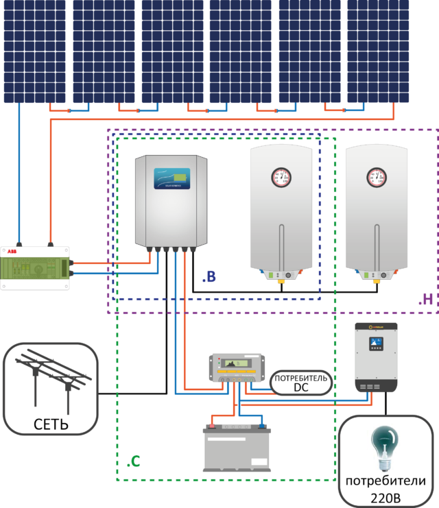 Декілька варіантів конфігурації та потужностей дозволяють гнучко керувати утилізацією надлишкової електроенергії, що виробляється фотомодулями. Наприклад, за наявності надлишків енергії від фотоелектричних модулів можна не тільки нагрівати воду, а й заряджати акумулятори для забезпечення безперебійного електропостачання (конфігурація C).