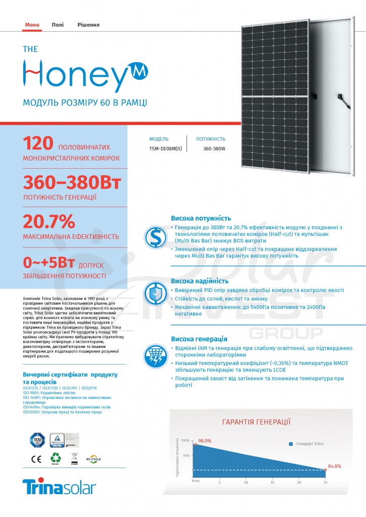 Сонячні панелі Trinasolar Honey ціна та покупка