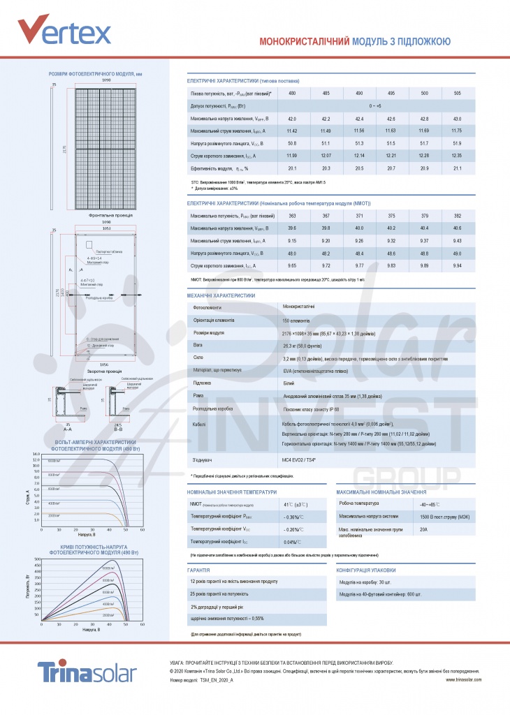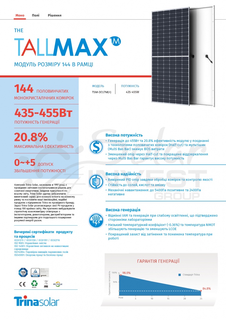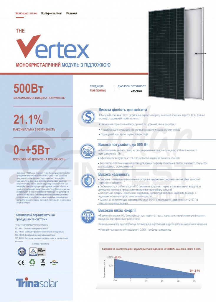 Гарантія 12 років на продукт, гарантія 25 років на лінійні характеристики вихідної потужності (80% продуктивності).