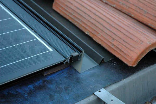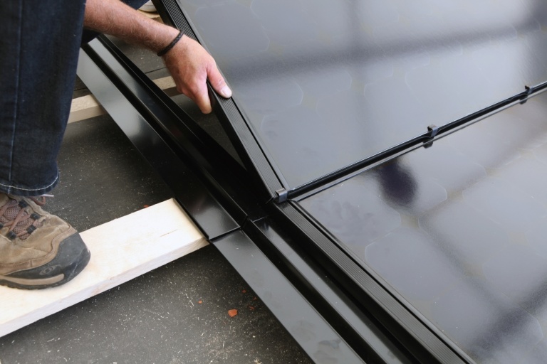 Проста установка сонячних BIPV фотомодулів із системою кріплення Solrif – сонячні панелі утримуються металевими затискачами, які кріпляться до рейок. Це забезпечує швидку та легку установку .